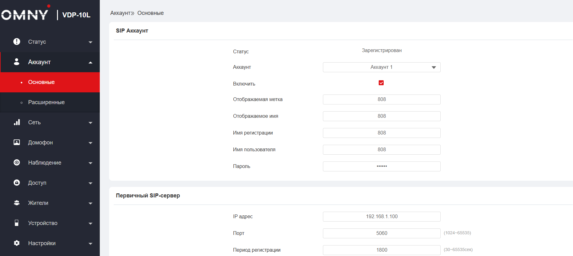 Для вызова абонента с дополнительной панели, прямо не подключенной к коммутатору (второй вход, калитка), необходимо на ней создать пользователя с параметрами, как на рисунке ниже.