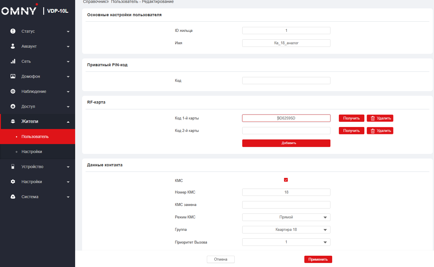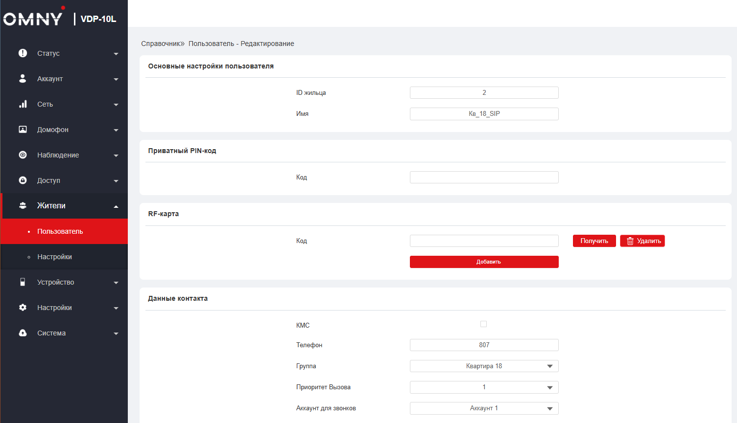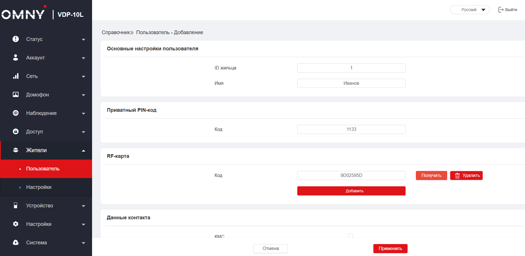 Заполните необходимые поля. Для добавления карты (метки) пользователя нажмите кнопку Получить и поднесите ее к считывателю домофона, либо введите имеющийся номер вручную в соответствующее поле. При необходимости наличия более одной карты у пользователя, нажмите Добавить и повторите описанные выше действия. Длина PIN-кода должна составлять от 2 до 8 символов. При использовании PIN-кода используйте формат на домофоне #PIN-код# для открытия двери.