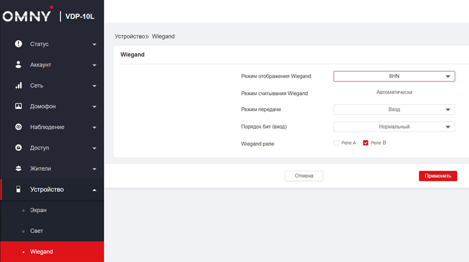 Вызывная панель позволяет организовать работу 2 точек доступа. Реле 1 может управлять основной дверью. К реле 2 можно подключать замок дополнительной двери. Считывание карт 2 двери будет происходить при помощи дополнительного считывателя, подключенного к вызывной панели по стандарту Wiegand. Для настройки данной возможности перейдите в раздел Устройство > Wiegand, и укажите в пункте Wiegand реле - реле B, как показано на рисунке ниже. После проверьте формат отображения считываемой через дополнительный считыватель карты и если он отличается от основного, добавьте пользователю еще одну карту.