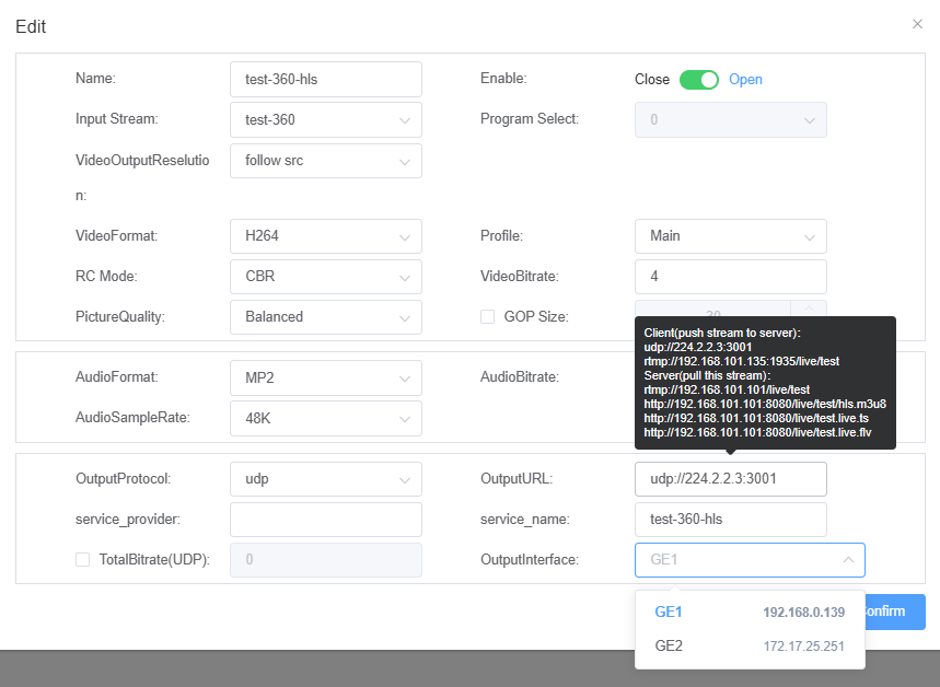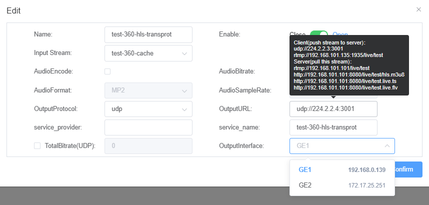 «OutputStream» отобразит интерфейс, в котором пользователи могут настраивать выходные IP потоки