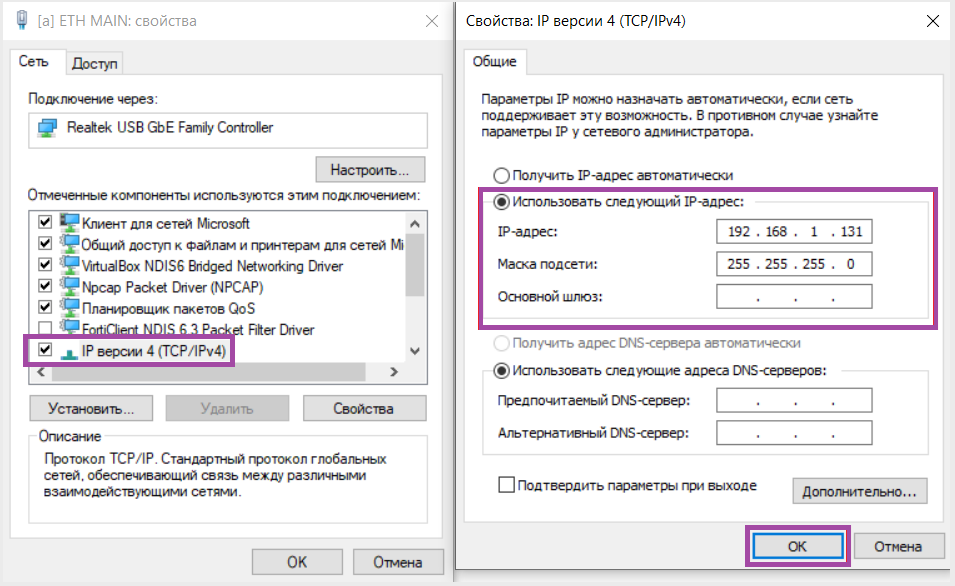 Перейдите к в настройки сетевого адаптера вашего устройства и присвойте значения: