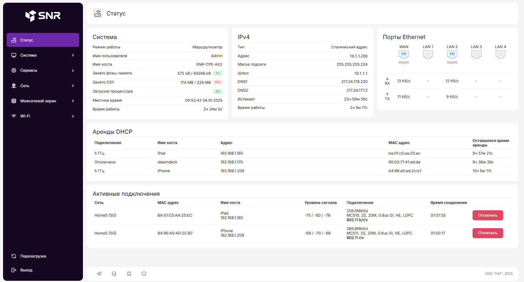 WAN / LAN1-LAN4 - текущее состояние (Full duplex или Half duplex) и скорость соединения для каждого порта.