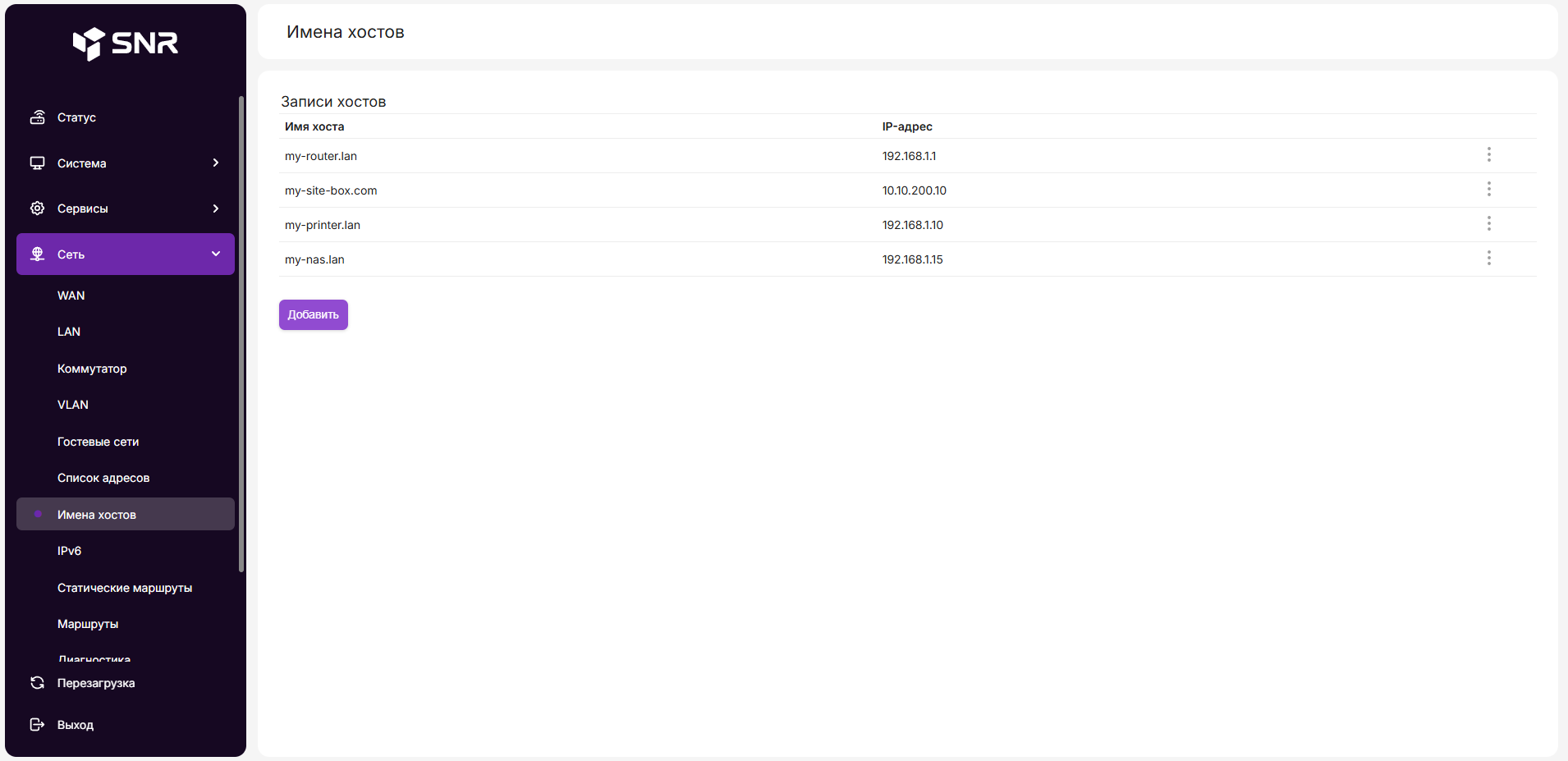 Раздел "Имена хостов" предназначен для создания собственных соответствий между доменными именами и IP-адресами. Эти записи позволяют маршрутизатору возвращать указанный IP-адрес при обращении к определённому имени внутри локальной сети.