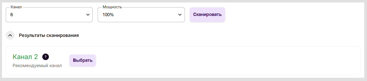 - статический канал - нажмите кнопку "Сканировать" для получения рекомендаций, затем кнопку "Выбрать" для выбора рекомендуемого канала.