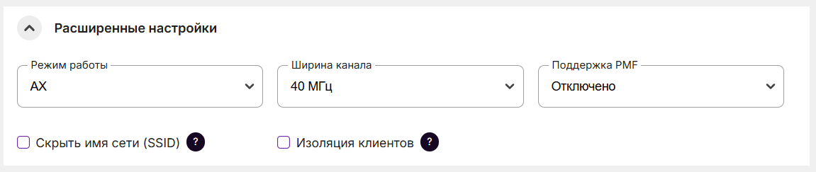 Однако, при необходимости можно вручную задать режим работы, ширину канала, включить защитные функции или изоляцию клиентов.