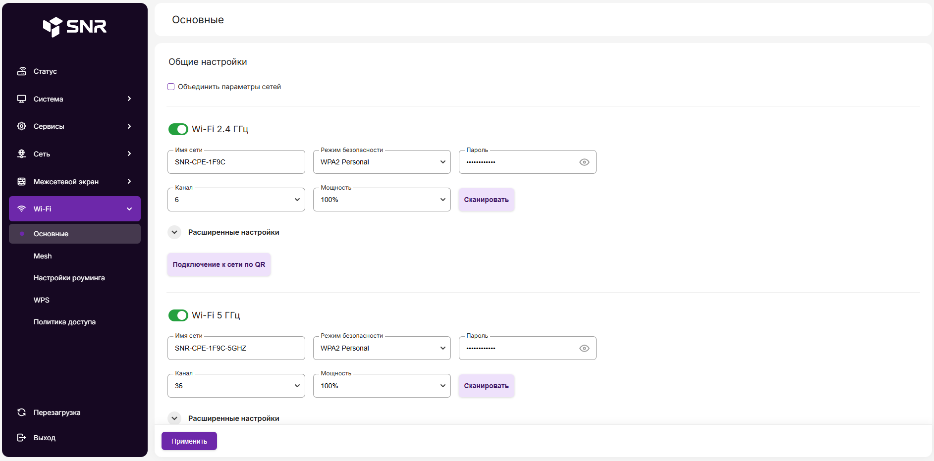 1. Перейдите в раздел "Wi-Fi" → "Основные" WEB-интерфейса роутера.