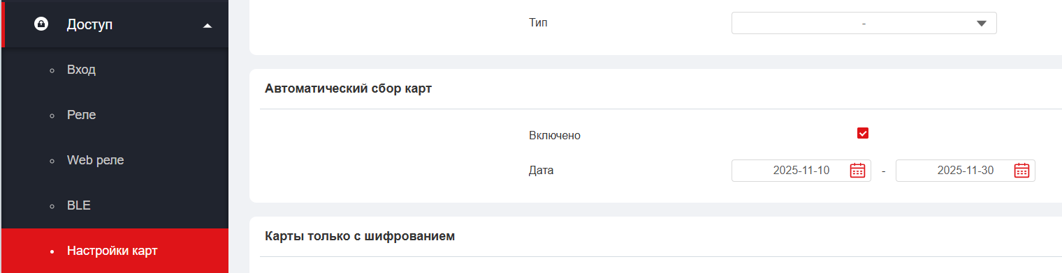 Для настройки перейдите в раздел Доступ - Настройки карт - Автоматический сбор карт.  Установите флаг Включено и укажите интервал работы функции.