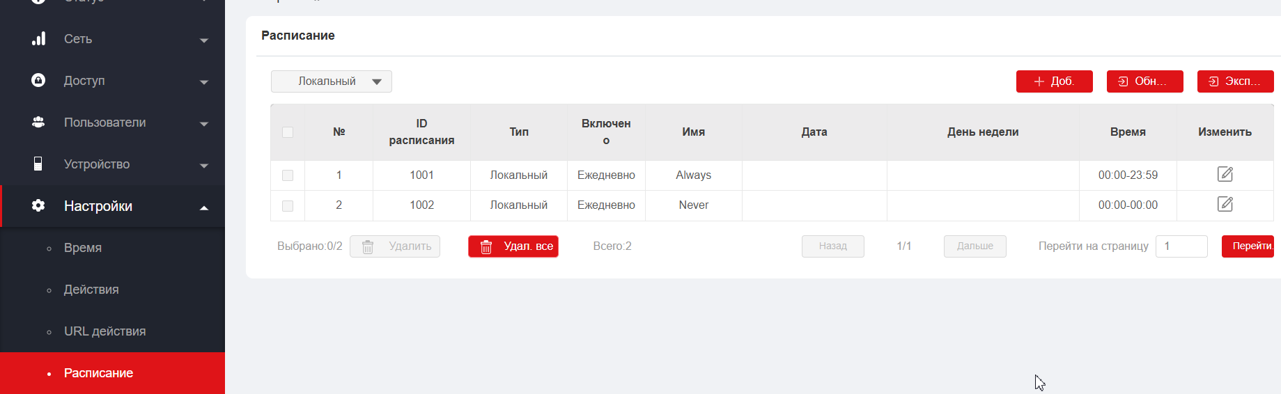 Расписание доступа к двери позволяет вам решить, кто и когда может открывать дверь. Оно применяется как к отдельным лицам, так и к группам, гарантируя, что пользователи, указанные в расписании, могут открывать дверь только авторизованным способом в течение определенных периодов времени. Для настройки перейдите в раздел Настройки - Расписание. По умолчанию создано 2 расписания: "Всегда" и "Никогда".