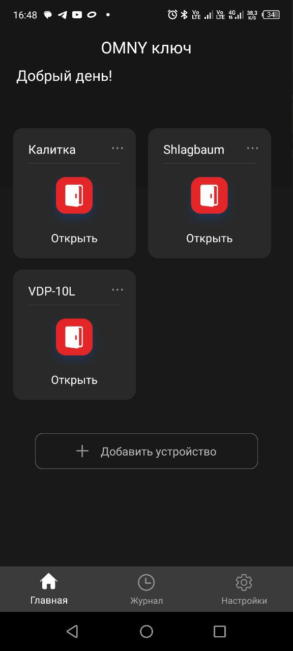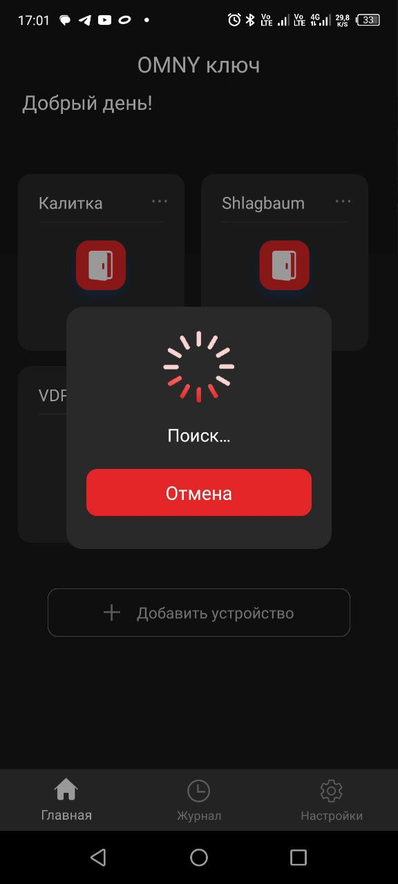 Запустите приложение. Находясь в непосредственной близости с терминалом  (не более метра), нажмите в приложении кнопку "Поиск".  При успешном выполнении пунктов выше, вы уведите на экране имя домофона и поле для ввода кода аутентификации, который был сгенерирован для пользователя. Введите код аутентификации в поле и нажмите OK, После этого в приложении будет отображаться новое устройство. Вы можете открывать дверь используя кнопку "Открыть", либо включить режим "Свободные руки", что позволит открывать дверь находясь на расстоянии при приближении к домофону.