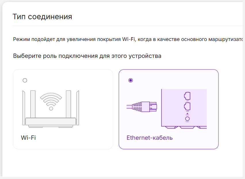 • В роутерах SNR KEEP выберите "Повторитель", затем тип подключения "Ethernet"