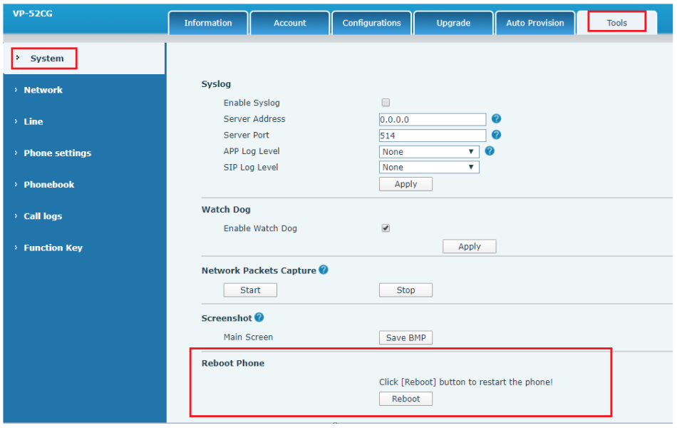 Перезагрузка IP-телефона находится в разделе «System» - «Tools»«Reboot Phone».