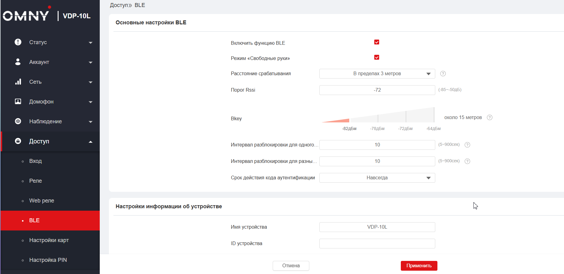 Для использования функции BLE перейдите в раздел Доступ - BLE. Установите флаг "Включить функцию BLE". При необходимости использования режима "Свободные руки" установите также данный флаг. Настройте параметры расстояния срабатывания и срока действия кода аутентификации. Укажите имя устройства (используйте латинские символы и цифры в названии)