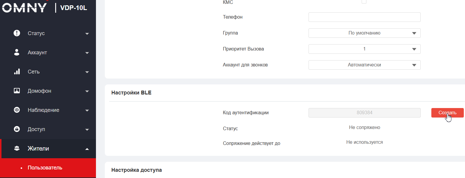 При создании/редактировании пользователя в меню Жильцы - Пользователь в разделе Настройки BLE, создайте код аутентификации (код для пользователя генерируется случайным образом самостоятельно). Сохраните настройки.