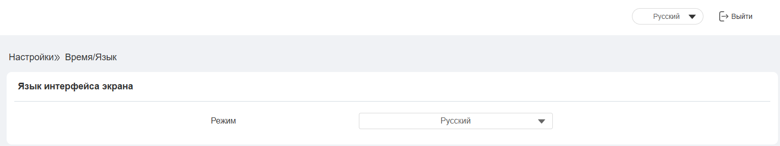 При первой настройке устройства вам может потребоваться настроить язык в соответствии с вашими потребностями, также вы можете сделать это позже, если потребуется. Язык интерфейса экрана можно настроить в разделе Настройки > Время/Язык. Настройка языка веб-интерфейса доступна с любой страницы устройства, в правом верхнем углу интерфейса.